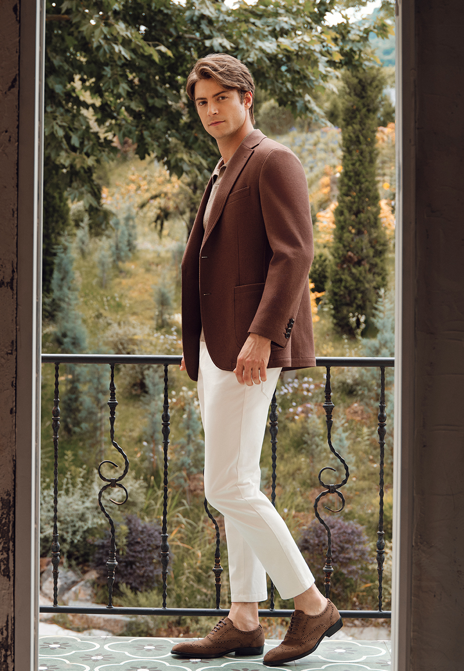 這款西裝采用平駁頭、單排兩粒扣設計,搭配上手巾兜與下貼兜,整體線條利落。周身以雙明線勾勒,簡約而不失細節;無胸襯、無墊肩的設計,更顯輕盈隨性,貼合身形。內里采用半里襯工藝,配合擼沿條設計,提升穿著舒適度與自由度。袖口裝飾四粒袖扣,平行鎖眼,于低調中彰顯精致質感。