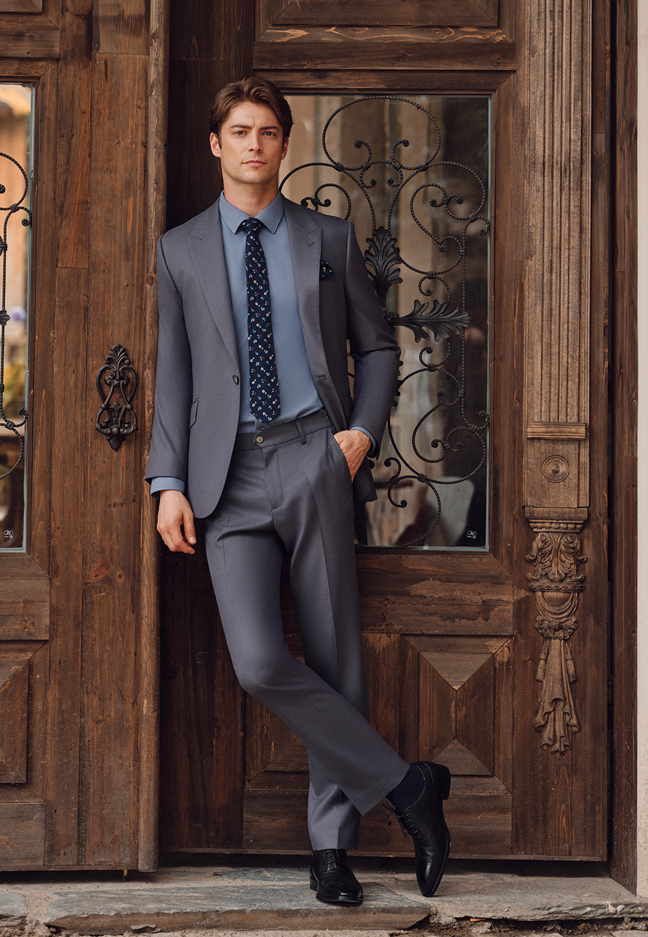 低飽和度的灰藍色西服,沉穩中不乏時尚帥氣的氣質,愜意又松弛。單排一粒扣配有利落戧駁領打破了傳統西裝的刻板印象,搭配斜西服口袋和四粒袖扣,精致顯氣場,配套西褲采用搭配橡根滑腰設計使穿著更加舒適,為商務場合增添了一些輕松的氛圍。