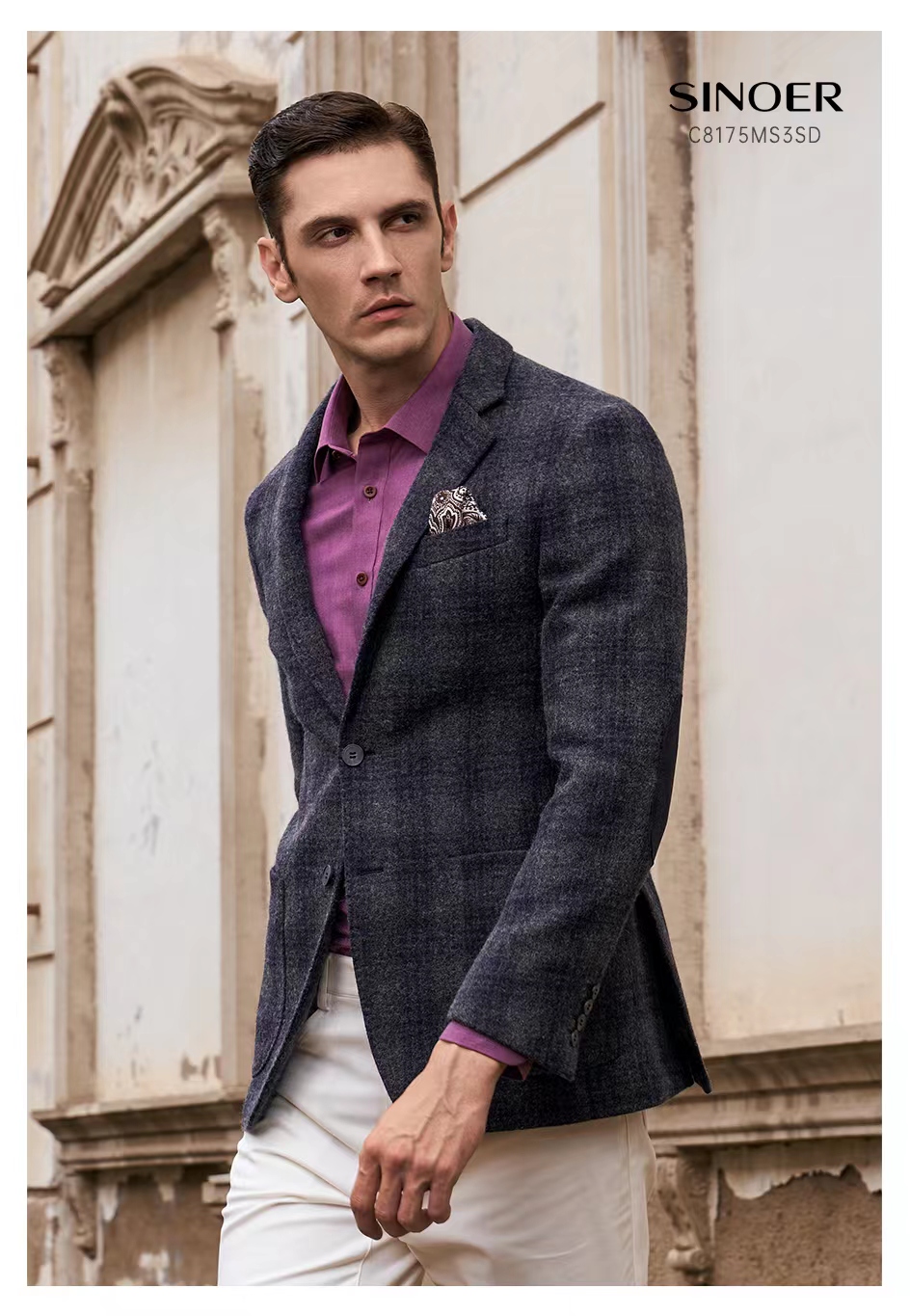 平駁頭6.5公分,單排兩粒扣,下貼兜款式,袖肘處增加拼接麂皮設(shè)計,增加耐磨度、舒適性,內(nèi)里采用印花里布,更具時尚性,同色系紐扣使衣服更加和諧,穿著時美觀且具有時尚感。